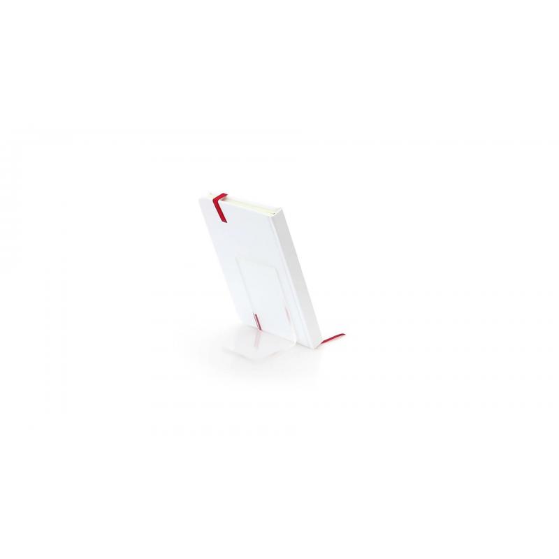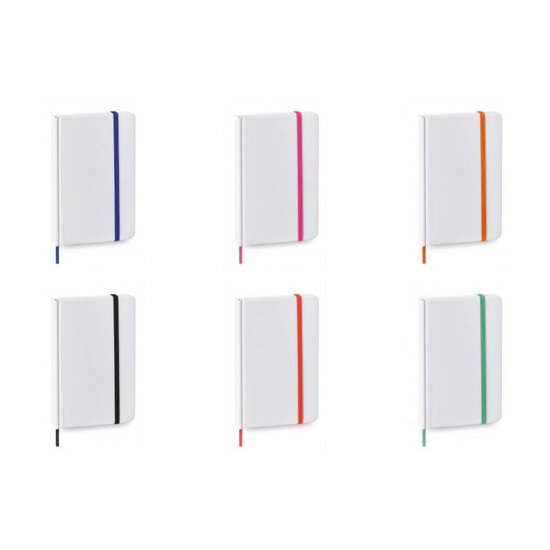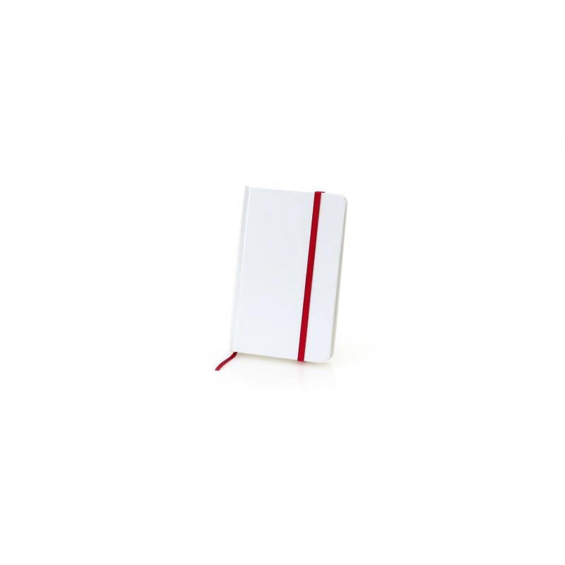 Bloc de notas con tapas de suave tacto acabadas en resistente cartón de elegante acabado en blanco. Especialmente diseñado para marcaje digital en tapas, cuenta con 80 hojas lisas además de elástico de sujeción y marcapáginas de tela a juego.