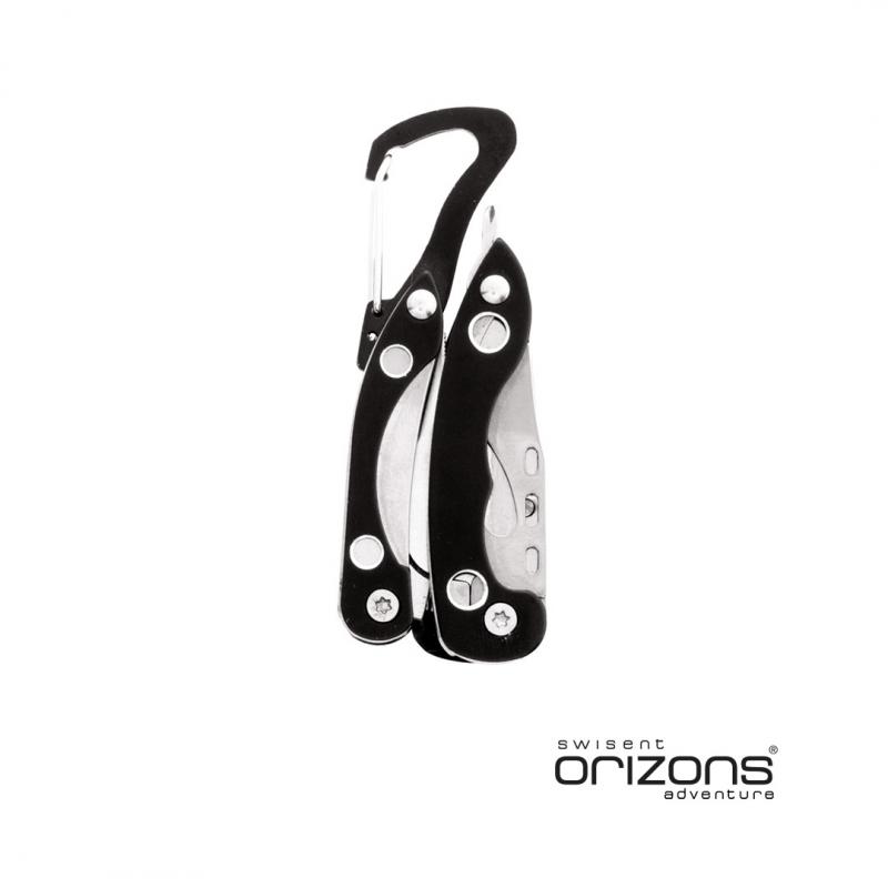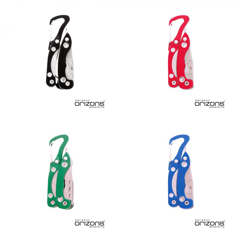 Multiherramienta de orizons con accesorios de acero inox de 6 funciones y mango de aluminio en vivos colores. Con alicates, navaja, abrelatas con destornillador de punta plana con función abrebotellas, destronillador de punta de estrella y mosquetón de acople. Presentada en atractiva caja de diseño con logotipo de la marca.