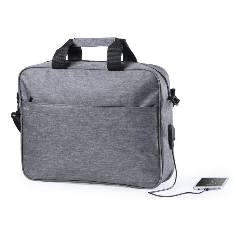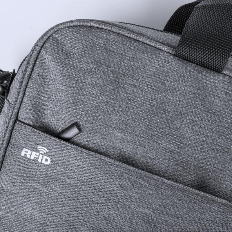 Portadocumentos de seguridad, con diseño urbano en resistente poliéster 300D. Bolsillo interior con protección de seguridad RFID (Identificación por Radio Frecuencia) que mantiene seguros los datos de la tarjeta y demás dispositivos. Asas con protección y compartimento principal con cierre de cremallera. Conexión USB -powerbank no incluido-, con bolsillos interiores acolchados para ordenador portátil de hasta 15 pulgadas y tablets de hasta 10 pulgadas. Cinta para hombro ajustable con protector acolchado.