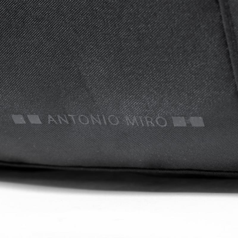 Bolso de Antonio Miró, fabricado en resistente poliéster 300D con acabados en negro. Compartimento principal y bolsillos exteriores con cierre de cremallera a juego; asas de transporte con velcro y bolsillos laterales. Con logotipo de la marca en la base y cinta bandolera ajustable.
