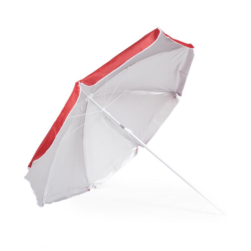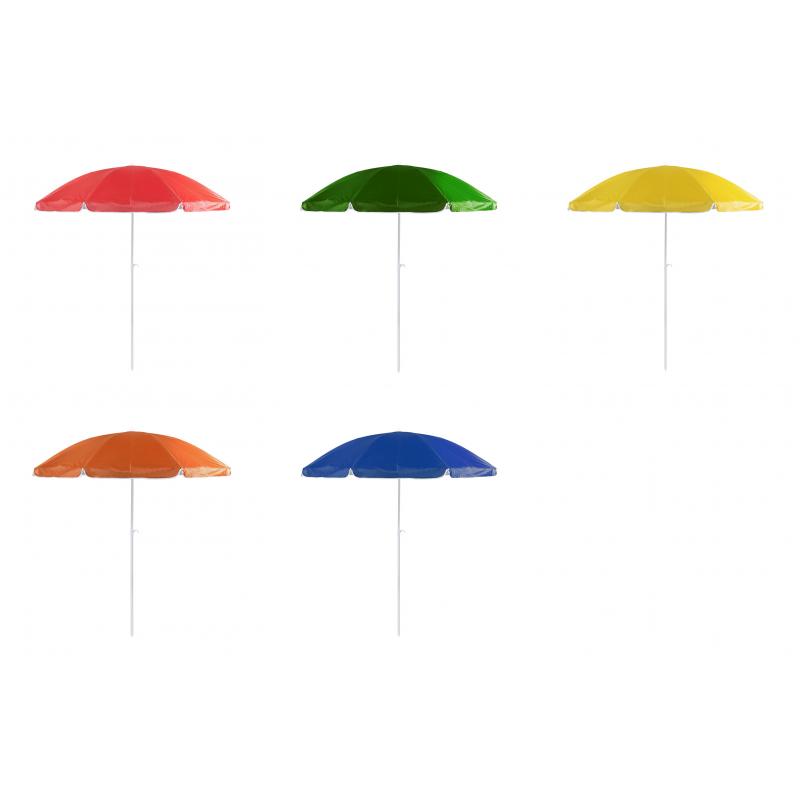 Sombrilla de playa de 8 paneles en resistente nylon. Interior en color gris plateado con protección UV, con tubo telescópico inclinable y ajustable en altura. 200cm de diámetro, con faldones laterales ribeteados, tubos metalizados en color blanco y disponible en una amplia gama de colores. Presentada en funda de nylon con cinta de transporte para hombro.