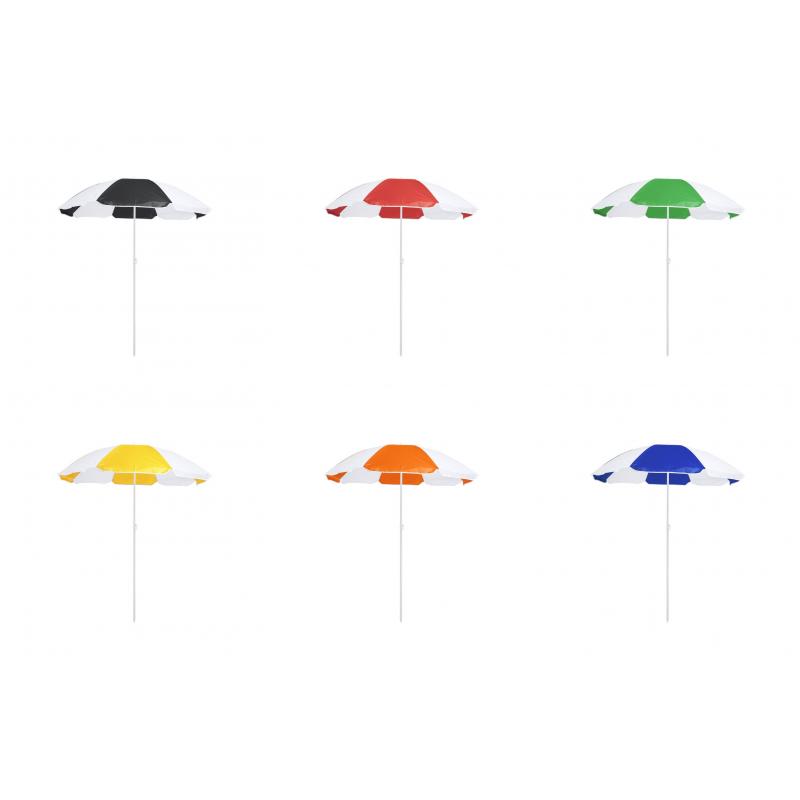 Sombrilla de playa de 8 paneles en resistente nylon de combinación bicolor. De 150cm de diámetro, con faldones laterales ribeteados, tubos metalizados en color blanco y ajustable en altura. Presentada en funda de PVC con cinta de transporte para hombro. Disponible en variada gama de colores combinados.Receptor :